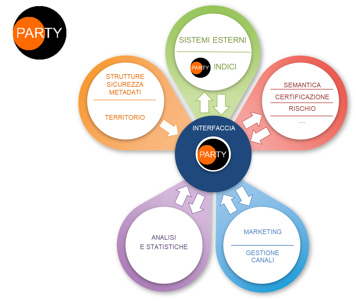 Repository integrato di riferimento per gestire il patrimonio informativo di aziende, enti o amministrazioni centrali o locali. Il fondamentale obiettivo di un trattamento dati è individuare correttamente e costantemente il "dato", la sua "funzione", ed il suo "ruolo": insomma trasformare il dato in vera informazione, assicurandone la validità e/o l'univocità. In un mondo in continua evoluzione, una gestione dei dati non relazionata può pregiudicare qualsiasi vero sviluppo operativo, gestionale e strategico e mettere in discussione la credibilità di un'azienda nei confronti del mercato. È quindi necessaria un'architettura che consideri tutte le relazioni e che ponga al centro l'individuo o l'oggetto. PARTY è il repository integrato di riferimento per gestire il patrimonio informativo dell'Azienda. I principali servizi riguardano il trattamento di: