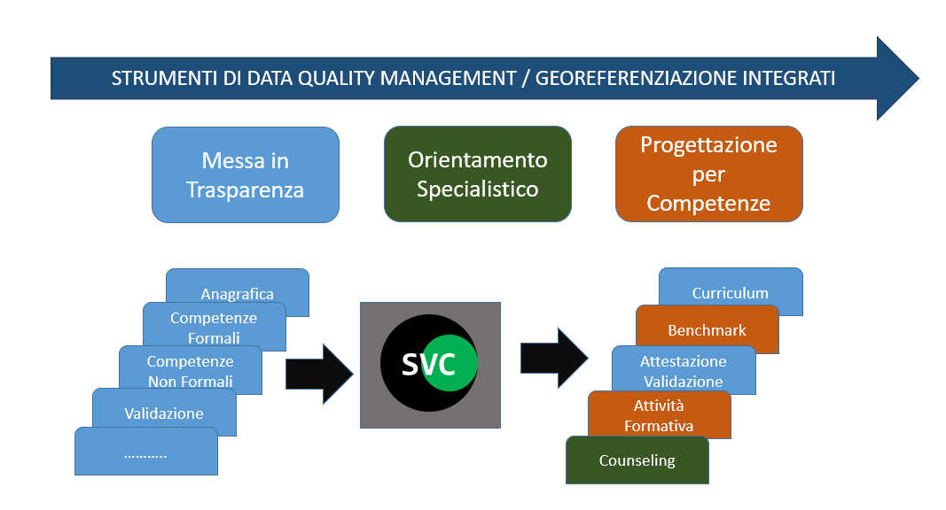 SVC è la soluzione a micro-servizi, completa e ready-to-use, per gestire efficacemente il processo di individuazione, messa in trasparenza ed attestazione delle Competenze, nonché il rilascio della documentazione prevista dal modello organizzativo (Messa in Trasparenza, Curriculum, Attestato, ecc.), sviluppata secondo gli standard normativi di riferimento integrando nativamente gli strumenti di Data Quality Management e Master Data Management di DW Roma.